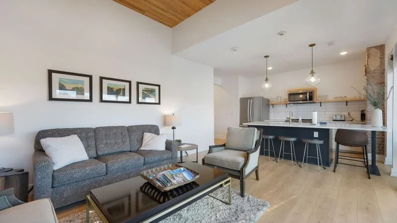This loft blends rustic charm with modern style, featuring reclaimed wood ceilings and quartz finishes. The master suite includes a king bed and spa-like bathroom, while a cozy queen bedroom offers an ensuite. Enjoy stunning lake views from the open living space and kitchen.