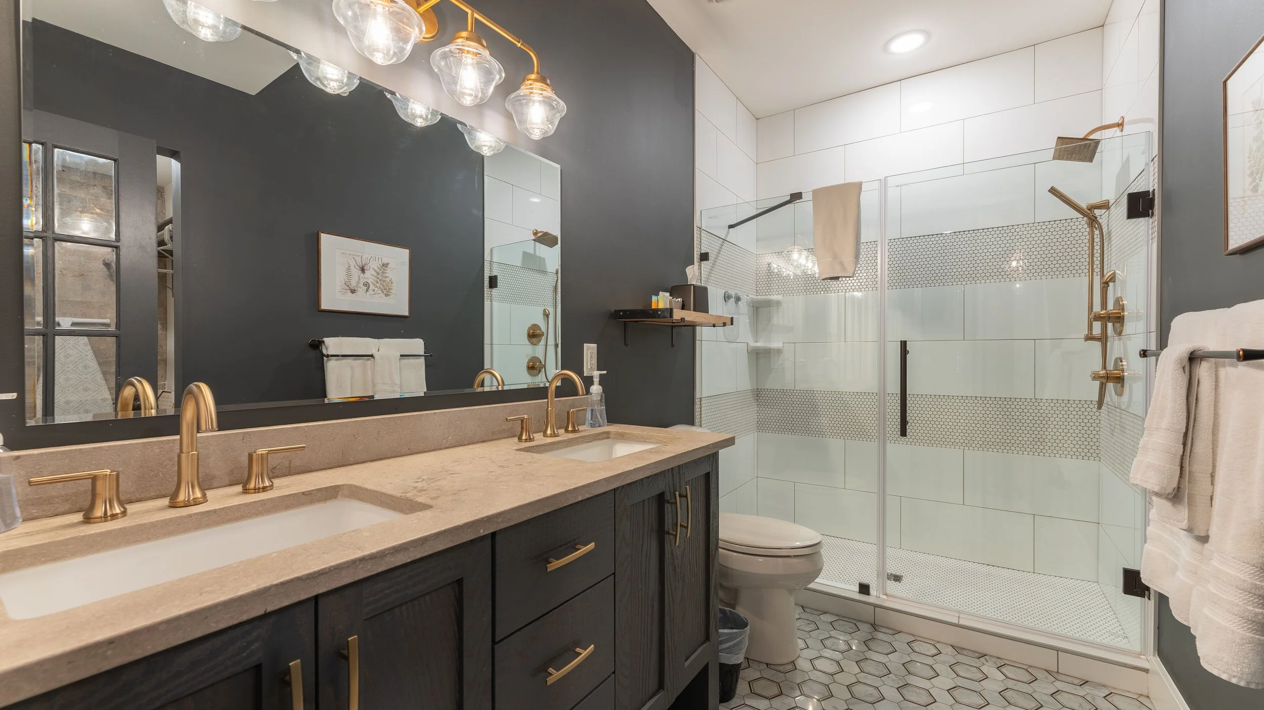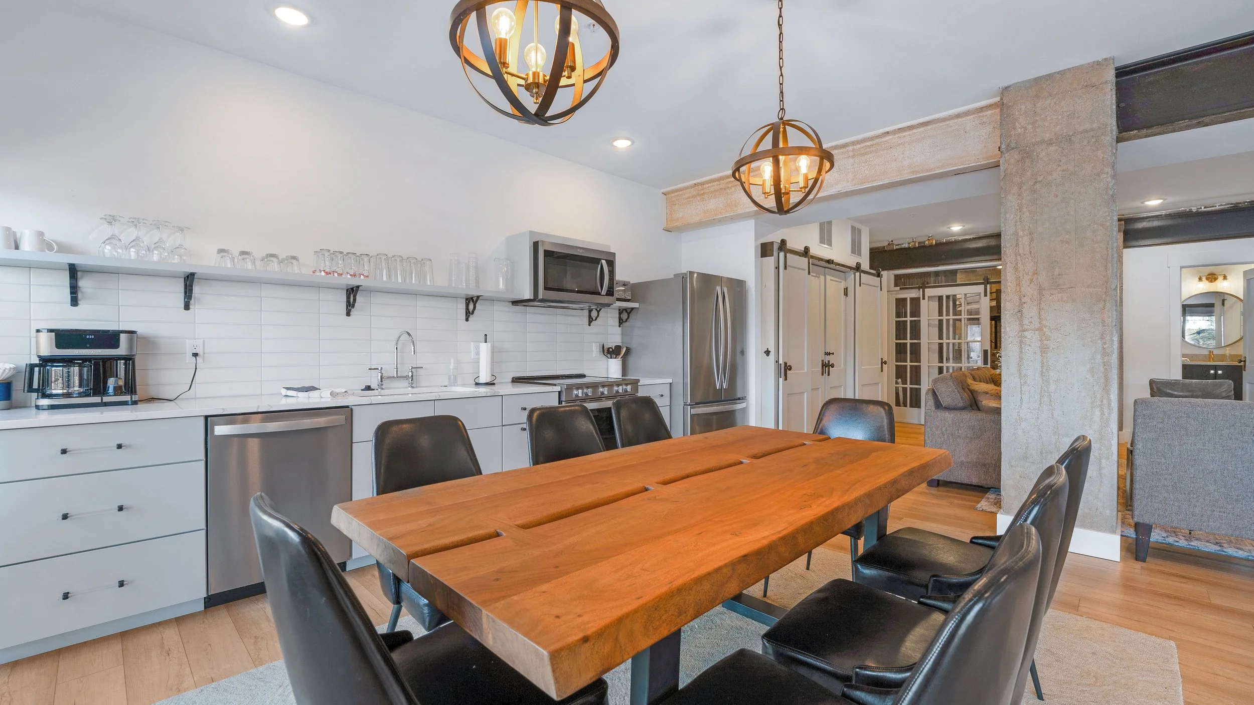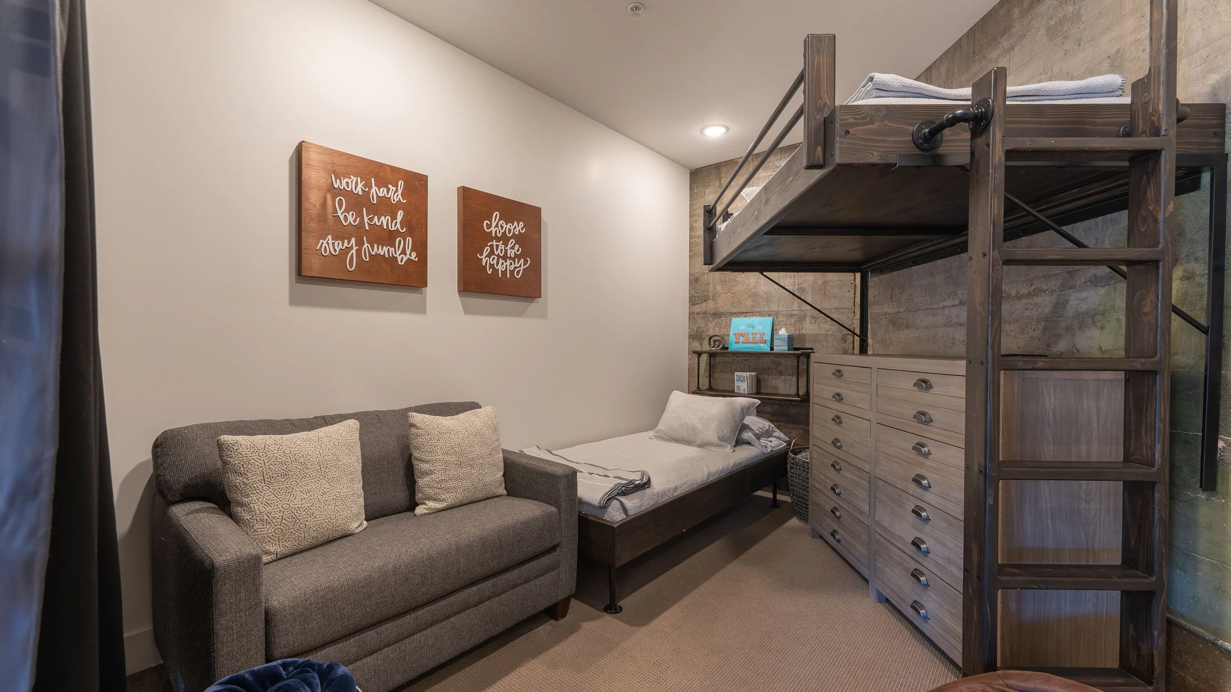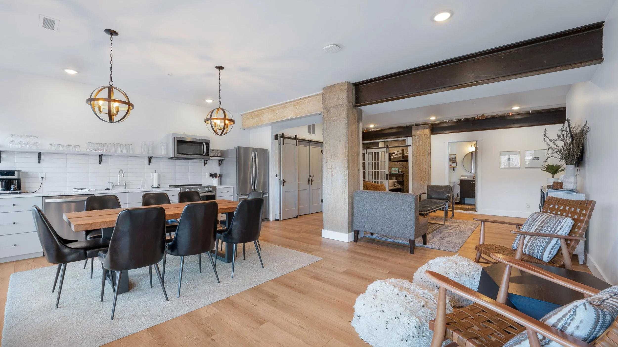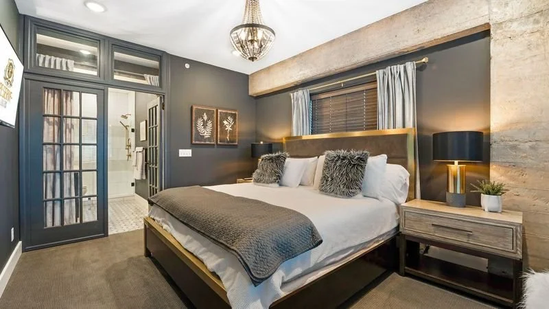 Located off the private pool deck, this unit combines historic steel beams with modern luxury. It features two king beds, a bunk room with a twin sleeper, and three elegant bathrooms, including a master suite with a double basin and luxury shower.