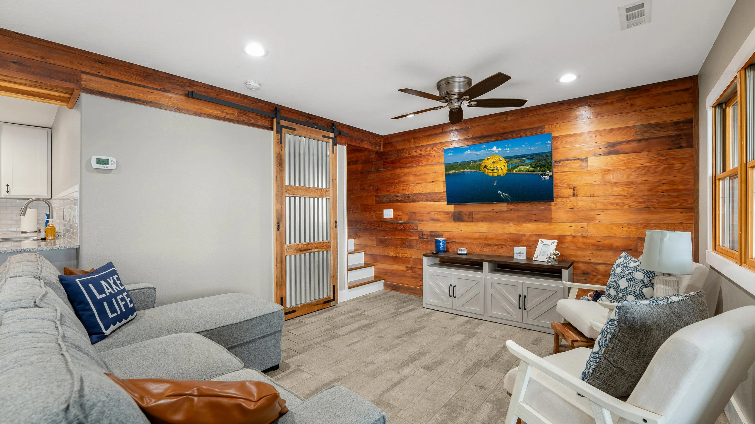A modern, light-filled home featuring a vaulted living space, cozy loft, and peaceful lake views. Enjoy stylish interiors, inviting outdoor areas with string lights, and a convenient location just minutes from marinas and restaurants.